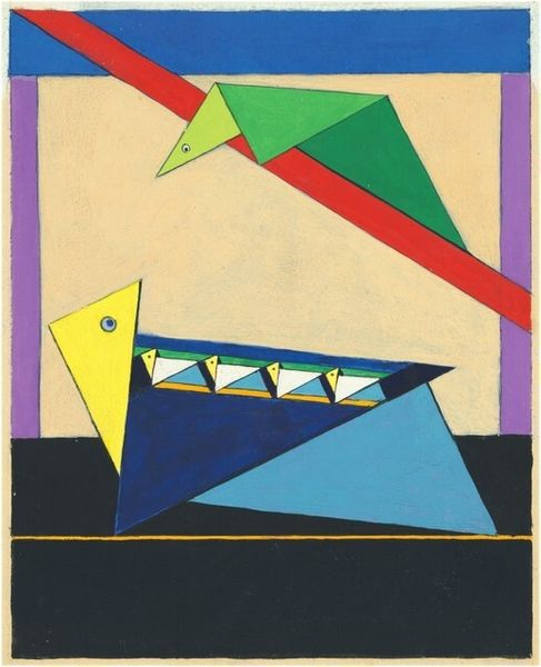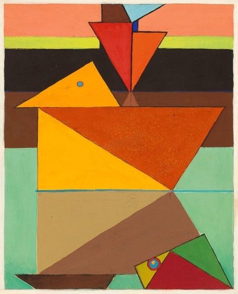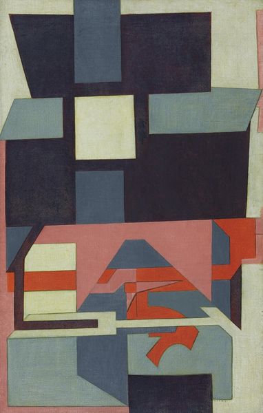 Curator: This is "Building in Space" a 1938 woodcut print by German-American artist Werner Drewes. He created this while working in the Federal Art Project. Editor: The fractured geometric planes feel disorienting and yet exciting at the same time, like a city being built, but also one that could easily fall apart. The bold, almost clashing colors add to that tension. Curator: Drewes work shifted away from expressionism towards abstraction after he was influenced by Bauhaus principles. And, his work during this period really exemplifies the anxieties around urbanism at the time. Think about the Depression Era. The city, previously understood as this space of opportunity, was now increasingly recognized as a space of mass poverty, displacement, and alienation. Editor: Yes, and Drewes does capture the disjunction between optimism and impending collapse doesn't he? The forms hover—there's no real groundedness. I’m drawn to the texture, though, particularly the wood grain. Curator: That texture reflects his dedication to printmaking as a democratic art. Accessible art production was central to the Federal Arts Project during the Depression. But despite the original motivations of this artwork being for public dissemination and consumption, Drewes work had trouble being widely recognized and supported. It makes you question the limitations of governmental support when attempting to intervene in art production. Editor: I suppose, I tend to focus more on what is included, instead of who funds it. I see echoes of Synthetic Cubism, how the interlocking planes build structure even without fixed perspective. You’re looking at multiple vantage points collapsed into a single picture. It's a really smart technique. Curator: Looking at “Building in Space," I am reminded about the larger context around New Deal art, and its complex place in shaping cultural memory in the United States. Editor: For me, it's the tension between the instability depicted and the material fact of this print; these flat shapes interlocking that creates a uniquely compelling sensation, making this composition all the more enduring.