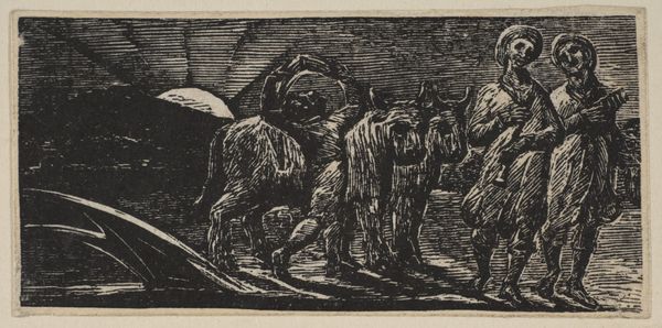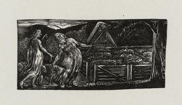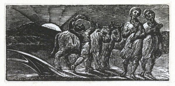 Curator: William Blake, poet and artist, created this engraving, ‘With Songs the Jovial Hinds Return from Plow’, and it’s held here at the Tate. Editor: It feels like a memory, a scene emerging from dreams... dark, romantic, with figures etched in stark contrast. Curator: Blake was deeply critical of industrialization, so it's fascinating to see his idealized view of agrarian life. This work, like much of his oeuvre, positions rural labor as idyllic, almost heroic. Editor: And the light! It almost blinds you at first glance. Look at the figures with their instruments—do you think they are really jovial? Curator: Well, Blake often used pastoral imagery to critique social injustices and advocate for spiritual freedom. The "jovial hinds" might be a commentary on the working class in general. Editor: Maybe "jovial" is aspirational, a yearning for simpler times? The music certainly adds to that feeling. Curator: The engraving technique itself lends a sense of timelessness, linking the present to a mythic past. Editor: It leaves me with a bittersweet feeling... a beautiful elegy for something lost. Curator: Indeed. A reminder that art often reflects our deepest hopes and anxieties about society and progress.