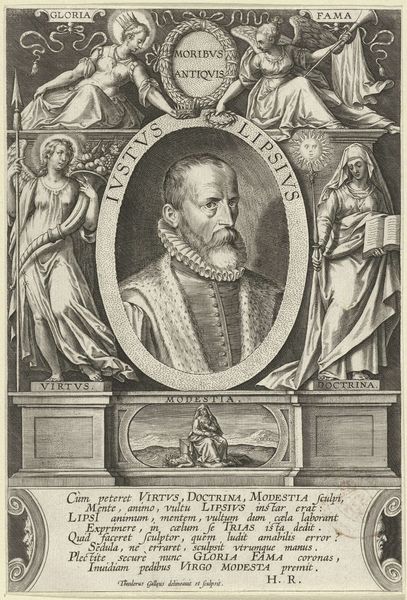 Curator: This engraving from 1764 is titled "Portretten van Maerten de Vos, Jan van der Straet en Jan Gols van Kaiserswerth" and it is by Jan l' Admiral. Three men are captured within the frame, each in a distinct portrait style. Editor: They seem imposing. Stern and unwavering. The sharp lines and limited contrast grant the faces a graphic strength that, frankly, feels very modern, despite the obvious signs of age and traditional style. Curator: This image compels us to question the relationship between artistic representation and societal power during that era. What narratives were privileged? What messages were encoded through portraiture? I'm especially interested in exploring how these individuals contributed to, or perhaps even challenged, prevailing norms and discourses. Editor: My eye is immediately drawn to the detail. Note the precise rendering of their clothes, their facial hair. The oval frame gives prominence to one subject, implying status, whilst the artist captures the texture of skin and fabric in these minute marks, turning people into symbols. Is that simply celebrating their presence, or conveying meaning? Curator: We can contextualize these individuals within the social and intellectual currents of their time. Consider the rise of individualism and the Enlightenment values shaping European society. The meticulous rendering serves to not only capture likeness, but also to underscore their individual importance, especially within these emerging philosophies. It begs the question: How did prevailing social structures influence the artist's approach and interpretation of each subject's identity? Editor: I wonder how audiences then interpreted these symbols. The ruffs, the beards – visual cues communicating status. These portraits weren't just about representing individuals, but also confirming and legitimizing a hierarchy. This iconography isn't exclusive to this print; how did this image engage in the shared lexicon of portraiture at that time? Curator: Examining these symbols, from a cultural perspective, reveals how artistic traditions evolve, resist, or reinforce dominant social structures and how notions of identity get constantly shaped through art history. Editor: I appreciate this insight, bringing us beyond just artistic style and opening avenues to the deeper meanings. Thank you!