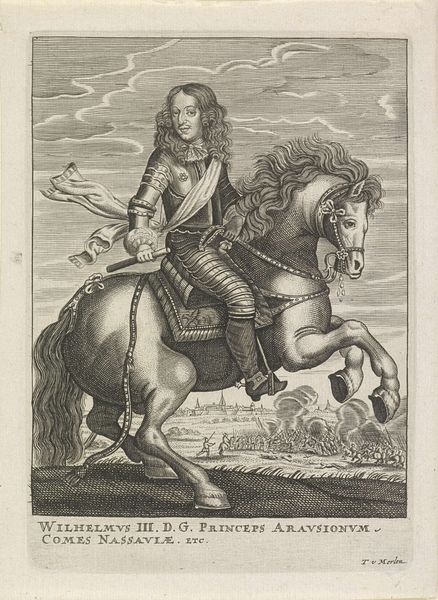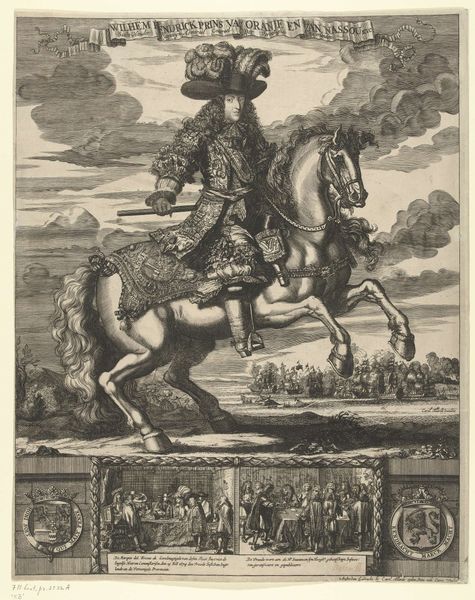 Wenceslaus Hollar etched this portrait of James II, King of England and Scotland. The composition divides the image into distinct zones, from the detailed foreground of the Duke and his horse to the distant background of ships and organized armies. Notice how Hollar employs line and texture to define form and space. The Duke, adorned in elaborate attire, sits astride a rearing horse, their forms delineated by fine, precise lines. These lines not only capture the textures of fabric and muscle but also convey a sense of movement. The regimented ranks of soldiers contrast sharply with the fluid lines of the clouds above, creating a visual tension between order and chaos. Through careful attention to perspective and scale, Hollar constructs a visual hierarchy that reinforces the Duke’s authority and projects an image of power. Such formal choices invite us to consider how Hollar engages with the semiotics of power and representation in his time.