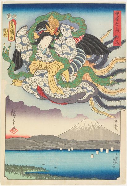 Utagawa Hiroshige created this woodblock print, titled *Jūrō and Gorō at the Hunting Ground at Miharano*. Notice how the foreground is dominated by the figures of Jūrō and Gorō, sharply dressed and set against a vibrant green field. This choice of color creates an immediate sense of dynamism, further emphasized by the two volcanic mountains looming in the background. The composition employs a fascinating interplay between near and far. While the foreground figures are rendered with great attention to detail, the background mountains and the hunting scene with archers are somewhat flattened. Hiroshige’s use of perspective isn't just about creating depth; it's about staging a visual narrative. The contrast between the detailed foreground and the receding background invites us to reflect on the symbolic distance between the heroic figures and the landscape they occupy. Ultimately, the enduring power of Hiroshige’s print lies in its ability to use formal elements like color, line, and composition to create a dynamic visual experience. It destabilizes our understanding of space and representation, leaving us with a sense of ongoing interpretation.