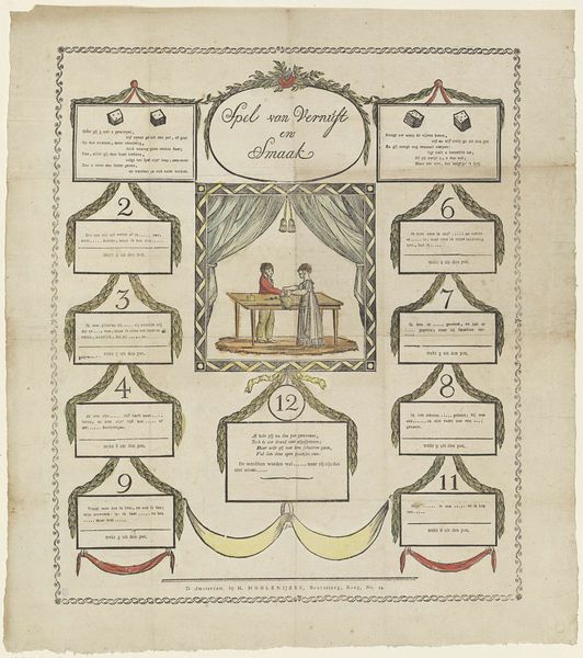 Editor: This is "Wensbrief met man in roeiboot," dating from sometime between 1812 and 1849, made with drawing, watercolor, and pen. It is on display here at the Rijksmuseum and it depicts what seems to be a tranquil river scene beneath a frame of decorative writing. What aspects of the artwork do you find most striking or want to share more about? Curator: Let us consider, first, the structural relationship between the calligraphic text and the figural representation. Observe how the meticulously rendered script, replete with elegant flourishes, occupies the dominant portion of the picture plane. Do you see how its verticality is mirrored, almost mimicked, by the slender trees that frame the watery vignette below? Editor: Yes, I see that. It's as if the writing itself becomes a landscape element. What effect does that structure produce? Curator: The composition cleverly juxtaposes two distinct modes of representation: the linguistic and the visual. The formal arrangement compels us to read the image, not just as a picturesque scene, but as a carefully constructed artifact, calling attention to its own artifice and design. The choice of delicate watercolor further underscores the constructed, rather than organic, nature of the artwork. Notice how even the limited palette contributes to this unified formal experience. Editor: So you're saying the key to appreciating it is recognizing how its different elements interact and support each other formally? Curator: Precisely. The semantic content of the letter is, in this respect, secondary. Our focus should remain on decoding the visual rhetoric employed by the artist. What do you make of the repeated curves and floral motifs that weave throughout the composition? Editor: I guess they create a sense of harmony and rhythm that tie it together. I didn't initially see it that way, I was too focused on the little scene with the boat! It's fascinating to consider it from a structural perspective. Curator: Indeed, shifting our focus allows us to recognize the work not just as a sentimental keepsake but as a sophisticated exercise in visual composition and symbolic form.