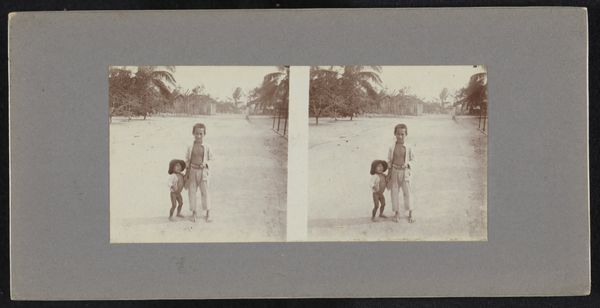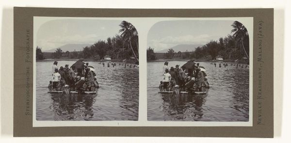 Editor: So, this is “Tinmijn” by Robert Julius Boers, dated sometime between 1900 and 1922. It’s an albumen print, so a photographic work. Looking at the composition, I notice how the figures and the machinery create a stark, almost geometric pattern against the softer background of trees and what looks like a hillside. What jumps out to you about this piece? Curator: The orthogonal structure of the timber framing and the repetitive verticality of the mining equipment create a powerful visual rhythm. Note also the subtle gradations of tone in the albumen print itself – how the artist exploits the light to define form and space within a seemingly straightforward documentary image. Do you perceive a tension in the relationship between the figures and the geometry surrounding them? Editor: I do see that tension. It's almost as if they are part of the machine itself, the way they are positioned. But how does the use of photography as a medium inform your reading of the image? Curator: Precisely. The photographic medium, in this instance, is utilized as a tool for objective observation but its composition and tonal qualities serve an aesthetic purpose, emphasizing structure and pattern over mere representation. The formal relationships established within the frame take precedence. It's not just about recording the tin mine, but about organizing shapes and values to create an aesthetically compelling image. Editor: That's a different way of looking at it. I tend to focus on what's being represented. Curator: The subject matter, while interesting, can sometimes obscure deeper appreciation for formal artistry and how its qualities shape the artwork's meaning. Editor: This discussion is enlightening. I'm more aware of how formal analysis allows for deeper understanding beyond the immediate subject matter. Curator: Indeed. Attending to visual form unlocks interpretive potential of the artistic composition and informs how to decode the visual patterns to arrive at an original interpretation.