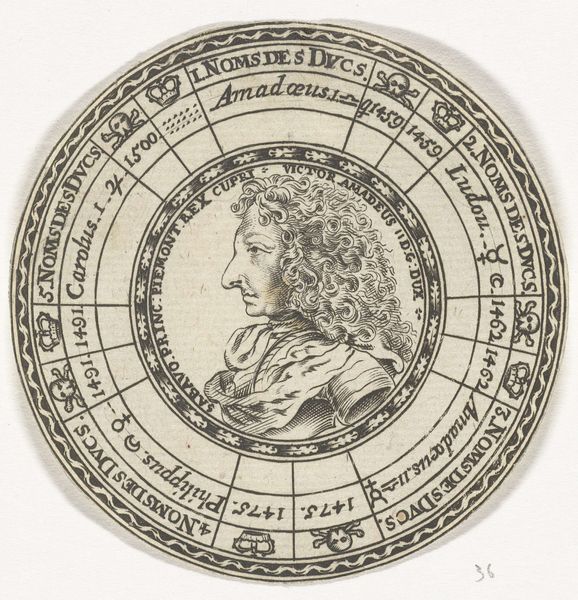 Curator: So, here we have a rather curious engraving. The inscription tells us it’s a commemorative medal, "Penning met het portret van de Heilige Willibrord en de namen van de bisschoppen van Utrecht,” dating roughly from 1685 to 1720. Editor: It reminds me of a pocket watch. The circle with lists and radiating lines makes it look less like a portrait and more like an instrument. Curator: Indeed. The central image is a portrait of Saint Willibrord, depicted in traditional garb, holding a crosier, surrounded by lists of the bishops of Utrecht over the centuries. Editor: So, it’s an attempt to ground this religious figure within a historical lineage. These names ringing him almost seem like a halo turned architectural support. The baroque detail, though restrained, is certainly present. The pattern created by names and numbers makes this an intricate, densely layered composition. Curator: I'm fascinated by how time is represented here. Each name anchors a moment, a human life dedicated to the church, laid out sequentially, and this engraving is clearly playing on notions of lineage, power and permanence, yet time eventually erodes all those things, doesn't it? Editor: Definitely. It’s like they're trying to create an unbroken chain of spiritual authority. You have the portrait acting almost as a linchpin. By enclosing it with this literal list, they are attempting to keep the narrative of tradition alive and concrete, maybe in contrast to some anxieties about modernity, perhaps? Curator: Exactly. In this context, even the choice of printmaking serves a symbolic purpose. Print as an instrument to carry religious messages over time… this seems less about saintliness and more about institutionality. Editor: Yes, more bureaucracy, less divine intervention! Curator: It’s a fascinating blend of religious imagery and administrative record. I hadn't noticed that play on institutionality, I love that. Editor: It’s quite thought-provoking, right? Like a visual encapsulation of faith, history, and power intertwined. I see that it’s meant for study, contemplation and record, all at the same time.
