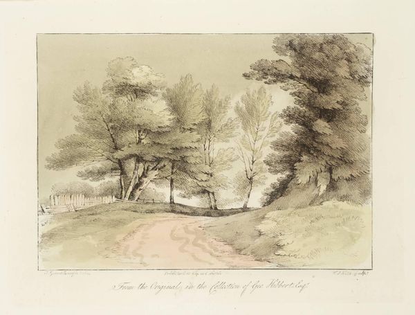 Editor: This print, by Thomas Gainsborough, currently residing at the Tate, presents a bucolic scene. I’m struck by the interplay of light and shadow and how the eye is drawn to the center. What stands out to you from a formal perspective? Curator: The composition utilizes a strong diagonal, guiding the viewer from the lower left to the cottage nestled amidst the trees. Note the contrast between the open, airy landscape on the left and the densely packed foliage on the right. How does this juxtaposition contribute to the overall reading of the artwork? Editor: It creates a sense of balance, perhaps? A kind of visual equilibrium. Curator: Precisely. And consider the textured lines created by the etching technique itself. These are not simply representational, but contribute to the artwork’s aesthetic value as well. I appreciated your reading of light in the scene, reflecting Gainsborough's painterly style. Editor: Thank you! It’s fascinating to consider how the formal elements alone create such a rich experience. Curator: Indeed. Through close observation, we gain access to the artist's intentions and the artwork's inherent qualities, irrespective of external context.