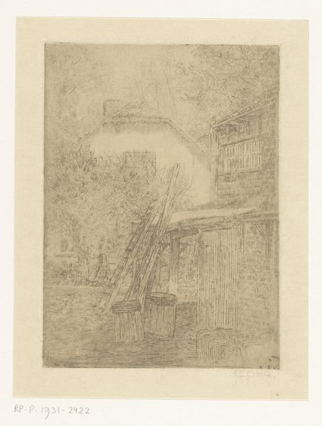 Editor: So, this is Johannes Löhr's "Boerderij met rieten dak," which translates to "Farmhouse with a thatched roof," an etching made sometime between 1892 and 1928. It's a rather humble scene, isn't it? What strikes you most about this seemingly simple depiction of a farm? Curator: The immediate pull for me is the house itself, a near-universal symbol. But this isn't just shelter; notice the way Löhr renders the thatched roof. What does that texture and those slightly drooping lines evoke for you? Editor: I suppose a sense of age, maybe even weariness? It doesn’t look brand new. Curator: Precisely. It carries the weight of time, of countless seasons endured. The thatch isn’t just a roofing material; it’s a record. And the dark doorway... doesn’t it seem to invite both curiosity, and maybe even a bit of apprehension? It reminds us of thresholds, the symbolic spaces of transformation in myth and lore. Do you think the bucket beside it has a significance, too? Editor: Maybe. Is it about work, a tool perhaps, and life lived at a particular pace? Also, the trees overhead… it feels very exposed to the elements. Curator: You're right to notice the environment bearing down on the building. Trees and foliage symbolize cyclical life. Do you suppose it's about how fleeting our own tenure is? Notice how it suggests that human structures, like the barn, are eventually reclaimed. Even the sturdiest looking construction seems vulnerable over the march of time. What do you think about that in relationship to your initial interpretation of a humble scene? Editor: It makes me see a hidden narrative, something more profound about time passing, life carrying on regardless... much more than just a farmhouse! I would have overlooked all of that! Curator: These scenes often serve as mirrors, reflecting back our own preoccupations and concerns. Next time, consider what they're showing you of yourself.
