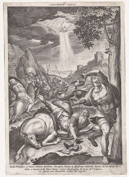 Curator: Jacques Callot, born in 1592, produced this print, Conversion of Saint Paul, which resides in the Harvard Art Museums collection. Editor: It's incredibly busy—a chaotic tumble of figures, with a stark contrast between the celestial realm above and the earthly turmoil below. Curator: This piece highlights a pivotal moment of transformation, portraying Paul's shift from persecutor to apostle, deeply intertwined with themes of power and divine intervention. Editor: Look at the density of lines, though. You can almost feel the pressure exerted by the printing press—labor rendered visible through meticulous crosshatching. Curator: Precisely! The etching technique Callot employs, allowing for detailed expressions, amplifies the emotional and ideological weight of Paul's journey. This imagery also touches on the politics of religious identity at the time. Editor: And those discarded shields—symbols of earthly power rendered useless! I wonder about the artisans involved in each stage of production—their labor contributing to the dissemination of this narrative. Curator: Absolutely. This work provides insight into how Callot, through his craft, mediated religious narratives within the social and political landscapes of his era. Editor: The print's intricate details force us to confront not just the narrative, but also the physical act of its making.
