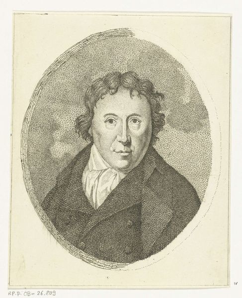 Curator: This portrait drawing captures Hermanus van Brussel, made sometime between 1798 and 1815 by Ernst Willem Jan Bagelaar. What are your initial thoughts? Editor: A reserved air surrounds this gentleman. The delicate lines forming the oval frame and the subject’s poised expression convey a sense of restraint, almost like a cameo capturing a moment in time. Curator: The subject's dress situates him within a historical context. That ruffled jabot speaks of privilege, perhaps even complicity with the societal structures of the time. Editor: Indeed, but I also see signs of transformation. The restrained hairstyle and simple lines could signal a shift away from older aristocratic excess toward something more "modern." He may well have been on the cusp of profound changes both societal and personal. The oval is an ancient, universal symbol here offering continuity of history through personal representation. Curator: Do you find continuity appealing? Given his potential position within systems of power, doesn’t continuity risk the perpetuation of injustice? Bagelaar's choice to depict this man becomes a political act—celebrating an individual connected to systems which would uphold disparity. Editor: While the temptation is to paint historical figures as emblems of their eras’ deficiencies, the portrait is intentionally devoid of definitive details or clues that could make him an emblem. Instead, it offers something else, universality and transition—something profoundly relevant today. Curator: Perhaps universality through abstraction is valuable. Still, I worry that we risk erasing the specificity of suffering, of very real injustices experienced. Who gets to be remembered—who gets to be made “universal”—and at what cost? Editor: I believe the intent is to show transformation through an evolution, and the drawing marks this passage. What else do you see? Curator: I suppose if read that way, it shows change as continuous and possible. Maybe there is a space for hope. Editor: Precisely, and for deeper meaning embedded within this portrait drawing. It’s been a stimulating dive into its cultural relevance.
