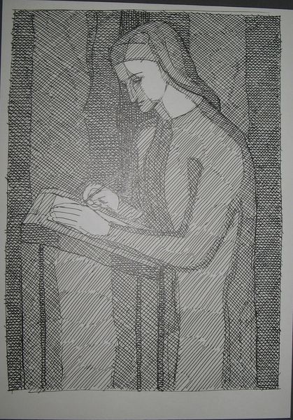 Editor: This is Hryhorii Havrylenko's "Dante. Illustration to Dante Alighieri's Book 'Vita Nova'," made in 1964 with pencil. I'm struck by how the use of lines creates texture, almost like fabric. How do you interpret the relationship between line and form here? Curator: The cross-hatching is undeniably central to the work's impact. Note how it dictates both the tonal variations and the implied volume. It isn't merely representational; it actively constructs the subject. Consider the density of the lines: where they converge, we perceive depth and shadow, giving shape to Dante's form and robes. How does this calculated application of line contribute to the overall feeling of the piece, would you say? Editor: It feels austere, almost somber. The lines are so uniform; they lack any sort of playful quality and seem to create a contained energy. I almost get a geometric and graphic feel from it. Curator: Precisely. The linearity lends itself to that reading. Now, observe the gaze of the figure and the implied light. Are these, perhaps, reinforcing that sense of gravity? Think about where the lines are more intense, darker, versus where they are sparse. The play of light suggested there. Editor: Yes, I see how the concentration of lines around his face directs my gaze, reinforcing his intense stare. Also how they illuminate one side of his robe. The light appears intentionally restricted. This intense concentration is interesting given this depiction of Dante illustrates *Vita Nova* Curator: An important consideration, yes. Notice how such control enhances not just Dante's physicality, but perhaps his intellectual rigor and emotional intensity as well. Editor: I'm really fascinated by how this drawing emphasizes structure and visual relationships through simple, but decisive linework. Thanks. Curator: My pleasure. It is in carefully deconstructing these formal components that we can access new understandings of a work, appreciating it on multiple registers.