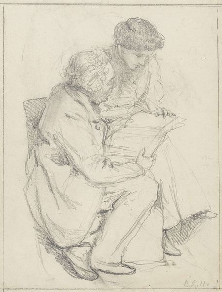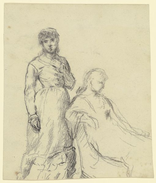 Curator: Before us, we have Alois Johann Penz’s drawing titled "Mother with Child and Standing Girl," which you can find in the Städel Museum's collection. The work’s ethereal quality is captivating. What do you see when you first look at it? Editor: Well, the immediate mood that strikes me is one of introspection and perhaps even anxiety. The standing girl seems to be caught in a moment of deep contemplation, hands clasped almost as if in prayer or worry. Curator: That's a beautiful interpretation. The figures certainly possess a gravity that draws the viewer in. It's interesting how Penz utilizes a kind of double image with the mother and child, making them appear almost spectral compared to the solidity of the girl. It's the psychology of relationships visualized. Editor: Exactly! The symbolic weight here feels dense, though rendered so lightly. That mother and child exist in a blurred background state, maybe suggesting a memory, a yearning. Her eyes hold so much symbolic value—as do hands. This image feels loaded. Curator: Indeed, loaded is the right word. The sparseness of the drawing—its reliance on line and minimal shading—almost heightens that sense of emotional tension. Penz lets the lines do all the talking. I am interested in his way of playing with light, in order to catch movement and psychological turmoil at once! Editor: The cultural memory encoded here touches on core maternal themes, but refracted through individual emotional experience. The visual echoes across time speak to timeless human connections. The ambiguity really stirs something deep. Curator: Absolutely. It's one of those works that whispers rather than shouts, inviting endless personal interpretations and associations. What I am left with, looking at these portraits, is what is implied. Editor: Yes, that balance between stark vulnerability and potent mystery… the drawing achieves a stunning equilibrium. I find myself pondering not just what is seen, but what isn't. Thanks for sharing.
