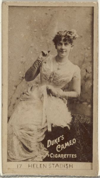 Curator: What a dreamy sepia tone! It makes me think of lost lace and perfumed letters. Editor: It’s an intriguing piece, isn’t it? What we have here is Mlle. Sorel, from the Actors and Actresses series, a collectible card created by Allen & Ginter between 1885 and 1891, part of a larger marketing strategy. Curator: Actors and actresses, yes, icons in their own right. It's interesting how even at that time, the visual language of celebrity was already so carefully constructed. That feathery boa—a symbol of the theater, of transformation. She's presenting an idealized image. But is it truly empowering or ultimately limiting? Editor: Indeed. Allen & Ginter were masters of crafting aspiration and desire. Cards like these were not just portraits, but symbols intended to appeal to burgeoning consumer culture. Consider the significance of tobacco and these cigarette cards during the rise of mass media and industrial capitalism. It’s an intriguing moment in time that highlights class dynamics and social mobility. Curator: And it certainly reflects the male gaze of the time—how women were portrayed within advertising and entertainment. Sorel seems so ethereal, almost passive, despite her profession. She becomes another object in this landscape. How subversive was she really allowed to be, within that framework? Editor: Looking at it as an iconographer, that feather boa might also symbolize transformation and performance itself, while the book she holds, almost hidden in her lap, can suggest intellect but also scripts she has to conform to. I wonder about the duality it conveys, playing a role and performing a gendered expectation at once. Curator: It makes me question how much control actresses like Mlle. Sorel actually had over their images and their careers, existing within these promotional constraints. This image serves as a testament to both their allure and potential lack of agency. Editor: And by studying such commercial artworks we expose the structures, biases, and socio-political dynamics embedded within cultural representation itself, allowing us to analyze its profound impact across different forms of media that extends even to contemporary artistic production and perception. Curator: This artwork makes one reflect not only on its period, but also about the continued objectification in advertising to this day, sparking meaningful dialogue. Editor: Precisely, images and symbols remain resonant and are not simply what they seem.