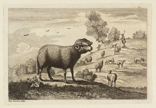 Curator: Oh, my, this strikes me as something of a shy pastoral scene—so tranquil, almost as if observed through a dreamy lens. Editor: That’s an interesting take. Let’s ground ourselves a bit. This is “Cape Ram,” likely rendered between 1777 and 1786, credited to Robert Jacob Gordon. We're looking at a watercolour, pencil, and colored pencil drawing, capturing, as you suggested, a pastoral landscape with the central figure of the ram. Curator: So, pastoral indeed! And those muted, earthy tones – they evoke such a sense of gentle observation, don’t they? The placement of the ram, almost centrally, gives him a proud yet humble bearing. He's a cultural figure, this ram. Editor: He certainly becomes emblematic, doesn't he? Rams often symbolized virility, determination, and leadership across cultures, including in antiquity. Its isolation between those trees could mean different things. Curator: Indeed. The trees framing him seem almost like symbolic guardians. Is it an evocation of paradise, perhaps? They speak to me of resilience and quiet strength. Even the unassuming watercolor technique, the subtle shadings—it adds a layer of humility to its imposing subject. Editor: Watercolors lend themselves to naturalism, that desire to represent something truthfully and authentically, right? Given Gordon's naturalist style, could this perhaps signify not just cultural meanings invested in rams but also colonial encounters with the natural world, particularly the African landscape? The text under the drawing mentions something in Dutch. Curator: Precisely! A dialogue unfolds: a cultural symbol viewed through the eye of scientific inquiry—a landscape filled with political potential and also serene nature. You've hit the nail on the head; a visual record imbued with more than simple representation. Editor: That balance, between observation and symbolic weight, colonial record and gentle artistry, makes it feel so rich to me. What do you take away as we finish up here? Curator: A profound sense of layered meaning, of seeing beyond the immediately picturesque into the deeper currents of culture and human encounter with nature. Editor: Agreed. I’m left pondering how historical and personal viewpoints merge in one seemingly simple rendering of an animal standing in a field.