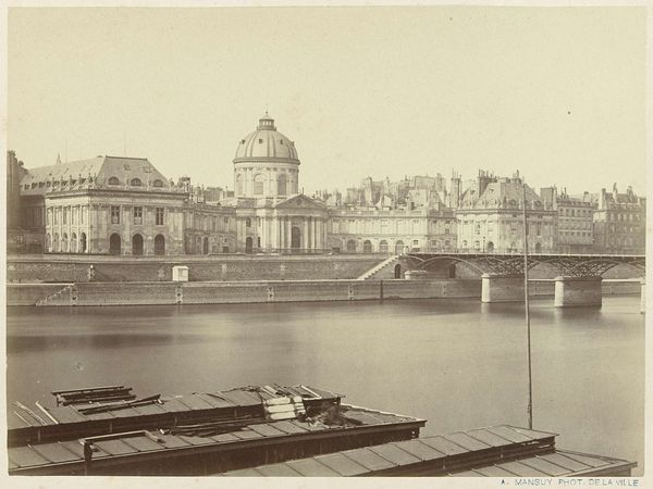 Editor: This gelatin silver print, "Gezicht op de Hogesluis aan de Amstel te Amsterdam," captures a view of Amsterdam, most likely between 1860 and 1900. What I immediately notice is how ethereal it seems, almost like a faded memory. What jumps out at you when you look at it? Curator: That's beautifully put, that sense of a faded memory! The sepia tones certainly contribute. For me, it’s about layers – of light, of history, of water reflecting architecture. Can you feel the pulse of 19th century Amsterdam, the clip-clop of horses on cobblestones, perhaps even a little mischievous breeze from the Amstel river? Editor: Yes, the sepia tones are a great way to look at this picture. Now that you point it out, the sense of the city in movement becomes obvious with carriages on the bridge. Do you think the somewhat faded appearance was intentional? Curator: I like your question. Whether intended or the natural result of time, the fading is, in a way, perfect, wouldn't you agree? Imagine what Amsterdam was like in 1880. It was likely not that crystal clear and sharp to begin with. This evokes the lived-in history; what once was a novelty becoming part of something even greater, something beautiful and historical. Editor: Absolutely. That's fascinating – thinking about the “now” becoming the historical as time continues. I’ll definitely look at older photography in a new light moving forward. Curator: Fantastic! It is always such a joy when perspectives are forever changed. What better way to connect with ourselves than by looking, really looking, at our yesterdays.