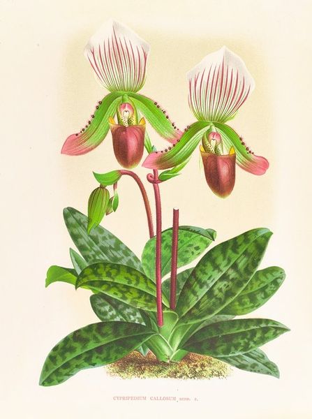 Jean Jules Linden rendered Cypripedium lawrenceanum var hyeanum, during a time when botanical illustration served as a crucial tool for scientific exploration and documentation. During the 19th century, the pursuit of exotic flora mirrored broader colonial ambitions. Botanical expeditions often served as extensions of imperial power, with explorers and scientists venturing into distant lands to catalog and collect specimens. The allure of orchids, in particular, captivated European audiences, symbolizing luxury, beauty, and the exotic allure of the tropics. Linden's delicate rendering invites us to consider the intersection of science, art, and colonialism. His illustration preserves not only the orchid's form but also the cultural and historical contexts that shaped its reception in the Western world. It speaks to the human desire to classify and comprehend the natural world, a desire inextricably linked to power dynamics and cultural exchange.