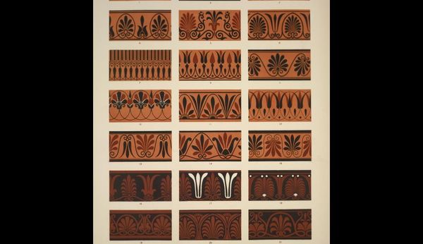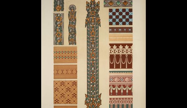 Curator: This mixed-media print and drawing is called "Nineveh and Persia, no. 1" by Owen Jones. Editor: Oh, my, a feast for the eyes! I'm immediately drawn to the geometric arrangement and chromatic scale of yellows, blues, reds, and browns, an exploration of seriality and plane in just one sheet of decorative patterns. Curator: Owen Jones, a key figure in the 19th-century design reform movement, was deeply influenced by his studies of Islamic art and architecture, particularly from regions like Nineveh and Persia. The drawing underscores how Jones sought to uncover the underlying geometric principles common across cultures, challenging Eurocentric perspectives of art history and design. Editor: It's fascinating how these designs seem both ancient and incredibly modern at once. Each individual pattern employs radial symmetries—circles and polygons create elaborate mandalas—echoing forms that reappear across many decorative traditions and the history of ornament itself. Curator: Yes, Jones's work reveals an Orientalist aesthetic that simultaneously romanticizes the "East" while also appropriating and commodifying its artistic traditions for Western consumption. We must ask what it means to classify something like this as "Islamic art," for instance, and unpack how power relations can be embedded within even the most visually appealing designs. Editor: Setting aside the contextual implications, what are your impressions about the layering, repeating geometry, the balance of the positive and negative space? Semiotically, we should investigate, how the individual symbols of these patterns build complex signifying systems, reflecting the artistic intention and structural unity. Curator: I see his patterns reflecting colonial dynamics, shaping ideas about the cultural and aesthetic value of non-Western societies. Editor: And for me, this print exemplifies the possibilities of applying geometry to formal structure and the potential beauty in patterns that recur both in the fine arts and crafts. Curator: Ultimately, reflecting on how such imagery, once confined to design manuals, can challenge how we approach design today, reminds us that there's no simple answer when trying to approach patterns produced by way of colonialism. Editor: Precisely, from the details of the image, from his line and design style, all come together as components that, assembled into a cohesive unity, are now made available to those eager for aesthetic insight.