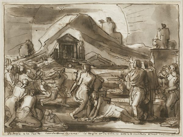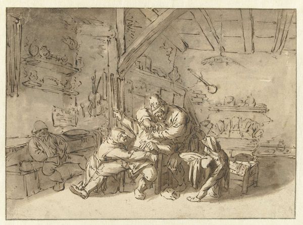 This drawing, "Stalinterieur met acht personen" by Cornelis Saftleven, presents a detailed interior scene using brown ink and brushwork. The composition is structured by the contrast between the densely packed foreground figures and the more open, atmospheric background. Saftleven’s treatment of space and form destabilizes conventional perspective. The figures huddle together, creating a sense of enclosure that is reinforced by the rough, sketchy lines defining the architecture of the stable. This tight arrangement contrasts with the looser rendering of the background, where details fade into a misty distance. The artist uses light and shadow to emphasize the textures of the stable’s interior, from the rough-hewn beams to the smooth surfaces of the jugs and pots. The monochromatic palette underscores the materiality of the scene. The work encourages us to consider how Saftleven uses form and composition to create a space that is both intimate and disorienting, challenging our expectations of interior scenes.
