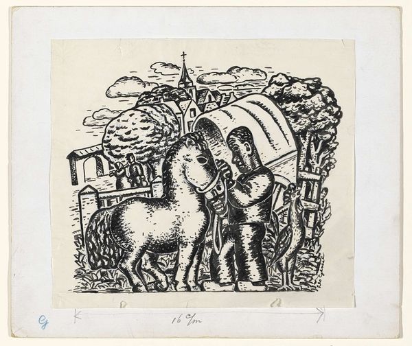 Curator: This pen and ink drawing by Leo Gestel, "Boerderij met paard," roughly translated as "Farm with horse", pulls us into a very textured scene of rural life, dated between 1891 and 1941. Editor: It's a fascinating depiction! I'm struck by the contrast between the intricate linework used to depict the natural elements and the more simplified rendering of the architecture. What does that tell you about Gestel's intentions? Curator: Precisely! From a materialist perspective, consider the availability and cost of ink and paper during that period. Was Gestel constrained by resources? The stark contrast could be less about aesthetic choice and more about the economic realities of art production. Also, is this piece part of a series? The medium hints that Gestel created this landscape en plein air, rapidly and with transportable and economical materials. Editor: That's a good point. I hadn't considered the material conditions so directly. How does Gestel's choice of subject matter, specifically the farm and the horse, fit into this analysis? Curator: The horse, often a symbol of labor, and the farm, the site of agricultural production, are crucial. Gestel is documenting, perhaps even celebrating, the Dutch rural landscape and its economy. Was he offering a critique, a romanticization, or simply a record? It demands we investigate the social context in which Gestel created this image, including labor practices, consumption patterns, and the societal value placed on rural life. Editor: So, beyond the surface-level image, you see a deeper engagement with the material realities of both art creation and rural existence? Curator: Absolutely. Examining the materials—the ink, the paper, the labor involved—and the depicted scene’s socio-economic context provides richer interpretations of Gestel's work. It also forces us to reconsider boundaries between art, craft and manual labor. Editor: That is insightful. I now recognize how considering the material aspects reveals hidden layers of meaning in Gestel's work. Thanks. Curator: Indeed. Every brushstroke, every line, and every resource tell a story far beyond the representational image itself.