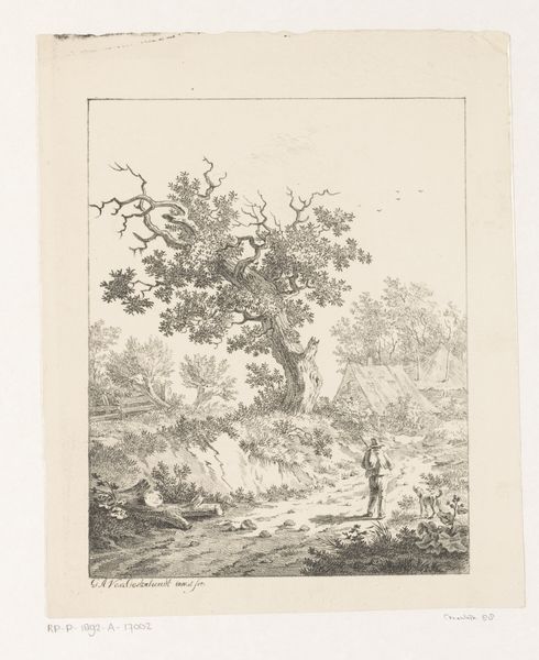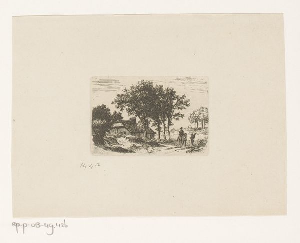 Editor: We're looking at Charles Jacque's "Landscape with Figure in the Water near a Rowing Boat" from 1846, made with etching. The detail is impressive. What immediately strikes me is how seemingly mundane a scene is made so compelling through the etching technique. How do you read this work? Curator: Consider how the etching medium itself democratized image production in the 19th century. Here we see landscape, but not just any landscape – one intimately connected to labor, notice the figure wading, the suggestion of a boat, presumably for fishing or transport. Jacque isn't just presenting nature; he's showing us its entanglement with the lives and work of ordinary people. Editor: So it’s not simply romanticizing rural life? Curator: Precisely. We must consider who had access to these images. Prints circulated widely, even among those who could not afford paintings. Etchings like these became part of a broader visual culture. What impact might it have when everyday citizens see artworks that include representations of work that resembles their own experience? Also, I think the roughness inherent to the etching process itself speaks to labor. What do you think about that aspect? Editor: I hadn’t considered that, the 'roughness'. It seems at odds with some academic landscapes that were prevalent at the time. Curator: It disrupts the hierarchy. This artwork allows us to consider how images are manufactured, distributed, and consumed within a society. Labor, materiality, consumption - all key to a materialist view. Editor: This has given me a totally new way to consider the work, moving beyond just its aesthetic appeal. The means of production definitely changes my viewpoint. Curator: Indeed! The method isn't secondary; it's intrinsic to understanding the image's meaning.
