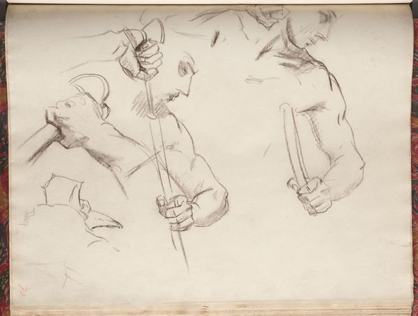 Editor: This arresting sketch is "Studies for Second Angel from Left, 'Israel and the Law,'" by John Singer Sargent. It feels dynamic, like a captured moment of raw, physical power. What strikes you most about this preparatory work? Curator: Oh, the energy practically leaps off the page, doesn’t it? For me, it’s how Sargent captures movement with such economy of line. It’s like he’s not just drawing figures, but the potential for action—divine action, no less, considering it's a study for a mural in the Boston Public Library. Editor: Divine action, yes! I hadn't considered the performative quality of the figures. Curator: Exactly! And think about the 'Israel and the Law' context. What does that pairing evoke for you when you see the figures like this? Editor: Now that you mention it, I am thinking about the tension between power and submission. It's made me think about how studies, sometimes, are more exciting that final works. Curator: Agreed! Sargent's murals needed this preparatory tension.