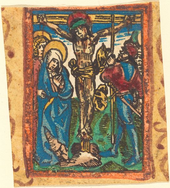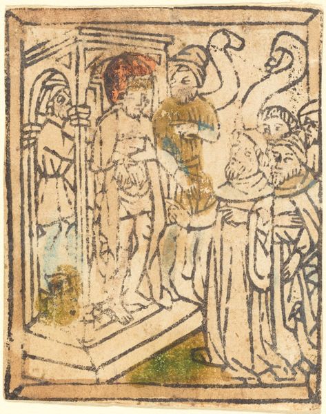 Curator: Well, look at this little marvel. What strikes you first about this print? Editor: There's a kind of whimsical quality to it, almost childlike, even with the gravitas of the subject. And the limited color palette pulls me right in; it has a tender, almost frail feel. Curator: It is extraordinary how something so small can speak volumes, isn’t it? This is “Christ at the Marriage of Cana,” dating from the 15th century. The artist, regrettably, remains unknown. What you are seeing is an intriguing combination of ink and colored pencil on paper. Editor: Ah, The Marriage at Cana—where water turned into wine! But presented in such an unassuming, miniature way. What was something like this even for? Was it popular imagery? Curator: These kinds of prints had many purposes! They were more easily reproducible than illuminated manuscripts, so they were less expensive to create and acquire. I can imagine them in personal prayer books or used as teaching tools. Editor: So more "democratic," in a way, accessible to broader audiences... I notice Christ’s halo is only partially filled with pigment. Was that typical? Curator: Good observation! It could be anything from an artistic choice to simply reflecting the incomplete coloring process inherent to the piece. Consider that medieval printmaking had less emphasis on precise editions. A feature, not a bug. Editor: Indeed. It's amazing how imperfections can add character! Looking closer, the jars in the front appear almost eager to be part of this miracle, waiting for purpose. Curator: Precisely! They remind me that this artwork invites us to reflect on miracles not as grand spectacles but as quiet transformations—occurring even in the seemingly ordinary. Editor: And maybe it subtly speaks to art's own transformative power, to elevate the ordinary—simple ink and color transforming paper to another world of beauty! Curator: That's wonderfully put. "Christ at the Marriage of Cana" truly is a powerful invitation for reflection and insight within a very human-scaled frame.