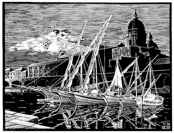M.C. Escher made this wood engraving, Marceilles, in December of 1936. What strikes me is the way the linear marks carve out a sense of depth and space; it's all about the process. Look closely, and you'll notice how the thick, dark lines of the bridge's structure contrast with the finer, lighter lines used to depict the city and the water. The texture he creates is so tactile, you can almost feel the grit of the stone and the ripple of the waves. Escher’s perspective tricks are so masterful, the way he manipulates positive and negative space creates a push-pull effect. It's not just about rendering what he sees, but about how he sees. Escher's exploration of perspective and spatial illusions reminds me a bit of Piranesi's etchings. But where Piranesi is grandiose, Escher is playful. His work invites us to question our perception and to revel in the ambiguity of the visual world.