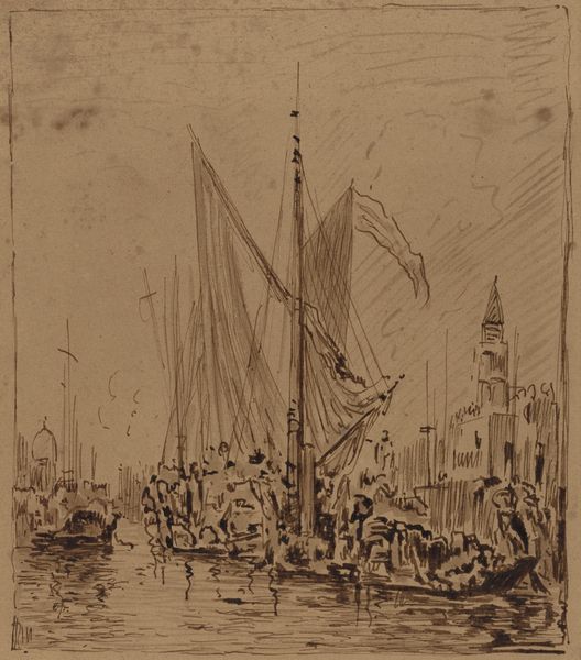 Editor: Here we have "Repairing the Sail" by Sir Henry Rushbury. It seems to be a sketch of a busy harbor. What do you notice about the social context of this scene? Curator: This drawing offers a glimpse into the working life of a port. Consider the date; Rushbury, born in 1889, likely captured a scene reflecting ongoing maritime labor. What public role do you think such images played? Editor: Maybe it’s a celebration of industry, or a documentary record of everyday life? Curator: Precisely. Think about how the Tate's acquisition and display of this piece contribute to our understanding of British identity and the romanticized vision of labor. I wonder if Rushbury had a particular socio-political agenda with this drawing? Editor: It's interesting to consider how museums shape our view of even seemingly simple sketches.