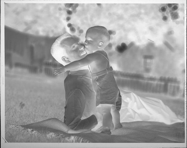 Curator: This is an untitled photograph by Lucian and Mary Brown, currently held in the Harvard Art Museums, it depicts three children in a bathtub. Editor: The high contrast creates a stark, almost unsettling mood. The composition, while simple, is very effective, drawing my eye to the children. Curator: Considering the context of early photography, images like these served as accessible records of daily life, capturing moments of domesticity. The lack of color adds to its documentary feel. Editor: Yes, but look at the geometry! The sharp lines of the tub juxtaposed against the soft forms of the children create a dynamic tension. Notice how the grid of the tile both confines and frames the figures. Curator: Such images were also deeply influenced by prevalent social norms, reflecting certain expectations of childhood and family life. The staged nature of the photograph speaks to that. Editor: Perhaps, but the spontaneous gesture of the child feeding the other suggests an unguarded moment. The inversion of light and shadow elevates the mundane to something ethereal. Curator: I find it interesting how such a seemingly private moment gains a public life through the museum. It really blurs the lines between personal and collective memory. Editor: Indeed, I'm struck by the stark simplicity and how it makes me consider photography's ability to transform the ordinary into something extraordinary.