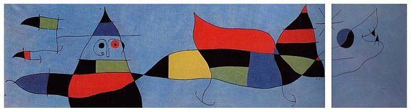 Curator: Gosh, that thing is unsettling...like a brightly coloured nightmare scribbled on a wall. Editor: Well, let's try to unpack that reaction. What you're responding to is Joaquim Gomis (Mural), an acrylic piece created by Joan Miró in 1948. You might initially perceive chaos, but what do you see if you spend more time with it? Curator: Okay, fine...I do like that the colours are quite happy. They almost seem too lighthearted for what I imagine to be the intent behind it. You know? The shapes remind me of something in my dream diary if that makes sense... They give off strong biomorphic vibes. The stark, bold flatness of colour...I don't know if that helps make more sense of my initial reaction? Editor: It's an entirely valid reading. Miró was a master of simplifying form to its essence and these organic shapes and clean lines harken back to a deep primal sensibility that transcends mere aesthetics. Notice how these disparate shapes almost communicate a subconscious language to us as observers...a visual vocabulary almost! How is that achieved here? Curator: Perhaps it is intentional...he is trying to use something inherent in human psychology and create meaning with that as the basis of that relationship between observer and art. The lines are suggestive and free and the piece breathes...The flat colour also seems to create the depth and a 3D sense through only 2D attributes...amazing really. Like building an alphabet out of emotional detritus. I dig it...do you think his titles actually make a difference? Or does it speak more powerfully on its own? Editor: Interesting question. Titles can of course shape our perception, providing a framework through which to interpret a work, though with someone like Miró, I lean towards the art existing perfectly independent of any linguistic prompt. The strength lies in his non-verbal communication, using abstraction to evoke pure feeling. As he said himself, he sought to, “murder painting”—to liberate it from the conventional restraints of representation. Curator: A successful assassination in my opinion! The kind where the victim continues living and starts a completely different life, totally unrecognisable yet utterly themselves. Editor: Exactly! A transformation. What began as disquiet has revealed, I think, something essential about accessing the non-rational depths of ourselves.