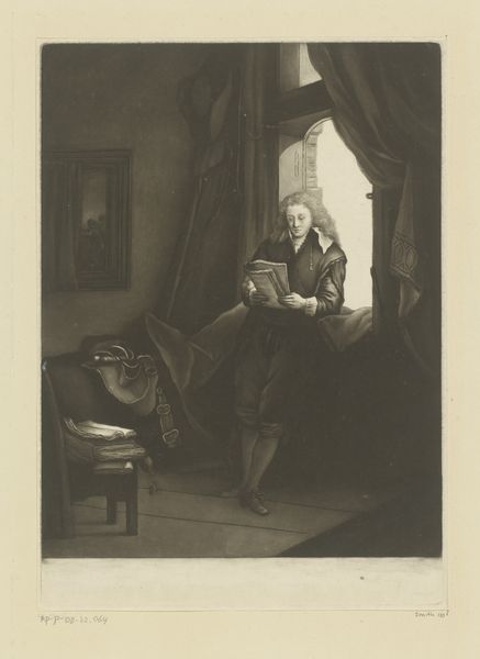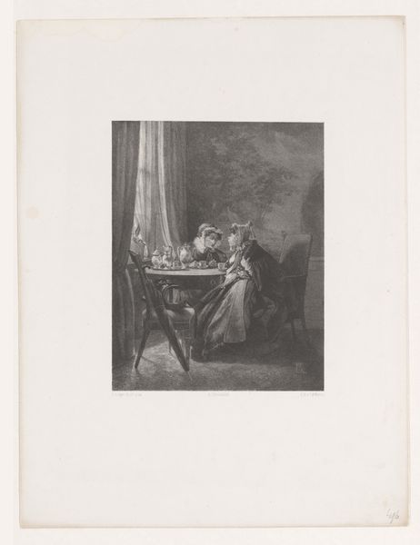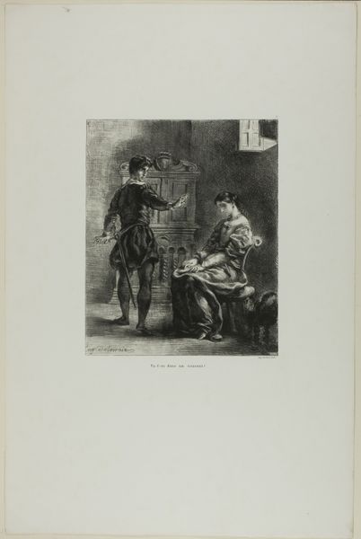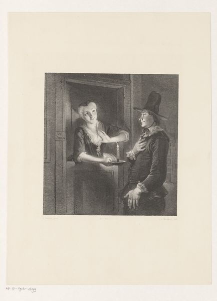 This print, made by Hendrik Wilhelmus Last in the 19th century, depicts a scene from a comedy, rendered through the intricate technique of etching. The image is built from finely engraved lines, capturing the textures of clothing, the play of light on faces, and the intimate setting of the encounter. Etching, of course, is a printmaking process, one that relies on the application of acid to incise lines into a metal plate. This required not only artistic skill, but also careful control of chemical processes. The resulting prints were then distributed widely, bringing images and ideas to a broad public. Here, the material qualities of the print—its delicate lines, the subtle gradations of tone—enhance the emotional quality of the scene. The soft light of the candle, held by the woman, illuminates the man’s hopeful expression, while the etched lines suggest the quiet intensity of this private moment. Appreciating the labor and craft involved in such a print enriches our understanding of its social and cultural value. The print becomes more than just an illustration; it’s a testament to the power of reproductive media, and the skilled labor required to produce it.
