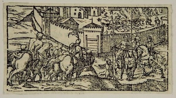 Curator: I see chaos and drama! The black and white contrast makes everything so immediate. Editor: Indeed. This is Canto 17, page 139, an anonymous engraving held here at the Harvard Art Museums. I'm struck by how it evokes a sense of violence and upheaval, possibly gesturing towards the socio-political tensions of its time. Curator: I love how the artist captures movement with all the linear strokes, especially in the water and the horses. It's like you can almost hear the sounds of battle! Editor: The ships in the background contrast with the foreground action, perhaps symbolizing the clash between sea power and land-based conflict. This also speaks to larger themes of colonialism, power, and exploitation. Curator: It does make you wonder who is fighting whom and what's at stake in the scene. Editor: Absolutely. Art like this serves as a historical mirror, inviting us to question narratives of conquest and consider the human cost of conflict.