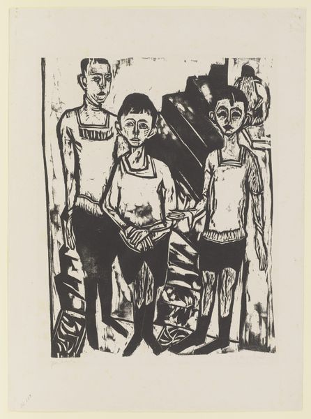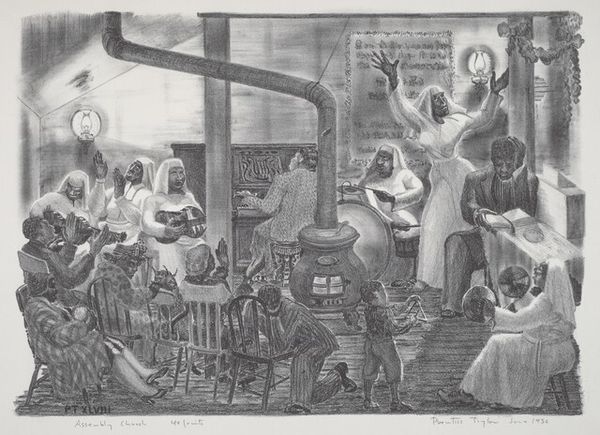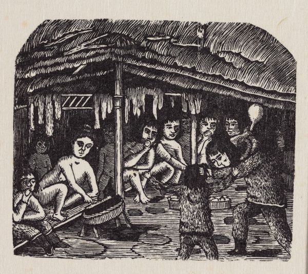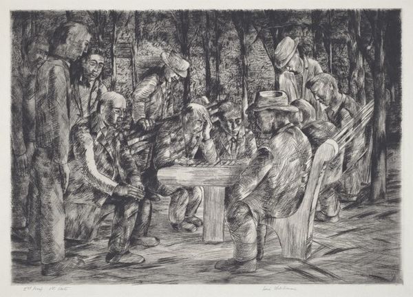 Editor: Here we have "Telebhaja," a 1994 print by Bruce Peck. The image seems to capture a slice-of-life scene, maybe a marketplace or street food vendor. What strikes me is how the artist renders it all with such dense linework, giving it this intense, almost palpable texture. How do you interpret this work? Curator: That’s a perceptive observation. Considering Peck's socio-political consciousness, I'd say this work transcends mere documentation. Notice the title itself – likely referring to a specific type of fried snack popular in South Asia. Peck isn't simply depicting a scene; he's engaging with issues of labor, class, and globalization. Who do you think might be left out or rendered invisible in a tourist's photograph of this scene? Editor: That’s a powerful question. Tourist photos often romanticize poverty, focusing on the "exotic" while ignoring the systemic inequalities at play. So you're suggesting Peck is pushing back against that kind of superficial engagement? Curator: Precisely. By choosing this subject matter and rendering it with such deliberate detail, he’s drawing our attention to the people behind the food, the labor involved, and the economic realities of their lives. The visual texture, as you mentioned, reinforces this: it's not a smooth, sanitized image; it's gritty, honest, and demanding of our attention. What could be a modern equivalent of this Telebhaja in your own lived experience? Editor: Wow, I see that the composition and details do create an impact. Thank you so much. I hadn't considered these dimensions! Curator: The work prompts a recognition of our place within broader global structures and challenges us to reconsider the dynamics behind the products we buy and consume daily.