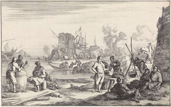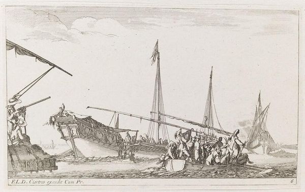 Editor: So this is "Galeischip met afgedekte brug in de haven van Livorno", or "Galley Ship with Covered Bridge in the Port of Livorno," from 1655. It's an engraving by someone known only as Anonymous, at least here at the Rijksmuseum. The light in this piece gives the scene such a feeling of bustling activity despite it being a fairly quiet, even subtle composition overall. What do you see in it? Curator: Oh, this takes me back! To the thrill of imagined voyages, the kind I played out with sticks as masts on windswept beaches. Notice how the covered galley ship almost breathes, doesn’t it? Like a resting beast draped in canvas. It sparks questions: What’s beneath that covering? Treasure? Secrets? And Livorno itself – a bustling port city, teeming with life! I'm immediately drawn to the everyday narratives playing out on the dock. Look at the tiny figures, each engaged in their own dramas! Editor: I hadn't really focused on those figures, but you're right, they each have their own story! It’s so detailed for a print. Curator: Prints were the Instagram of the 17th century, circulating stories and images far and wide. This piece gives us not just a snapshot of a place, but a taste of a whole world in motion. A slice of Baroque life if you will. Does seeing the figures make you wonder about the galley’s purpose even more now? Editor: It does, yes! I now have a thousand new questions. The mundane next to the monumental makes it so compelling. Curator: Exactly! Art isn’t just about grand gestures, it's often about the quiet hum of humanity alongside them. Never be afraid to bring yourself into it, and the artwork will return the favour. Editor: That's such a good way to put it. It gives me a whole new perspective to go forward with. Thank you!