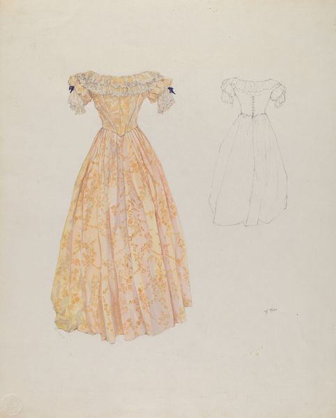 Curator: This drawing is called "Afternoon Dress," dating to around 1937. It's watercolor on paper. What are your initial thoughts? Editor: It has a certain delicacy. The pastel palette, the light fabric...there's a sense of restrained elegance that I associate with that era. And there's something interesting in that contrasting image beside the complete one: you can clearly distinguish the work in its stages. Curator: Absolutely. This piece, viewed through a feminist lens, reflects the performative aspects of femininity dictated by society at the time. Consider the restrictive silhouette, designed to enhance the waist and emphasize demureness. Editor: It’s interesting that you mention restriction. I see how the dress both defines and confines the female form through the materials, how those choices intersect with the labor involved in the design and, of course, eventual manufacturing, particularly considering how textiles impacted the workforce. Curator: Precisely. The creation of these garments was intrinsically tied to a gendered division of labor, impacting countless women, and also highlighting the complexities of labor rights and gender equity movements during the interwar period. Editor: And it's not only the finished garment that embodies labor. It's also the materials, the dye. The way the cotton breathes or fails to. Each carries its own legacy. Did Ray Price make more such design concepts available to the public? Curator: Ray Price created a substantial archive, allowing us today to contextualize this individual piece within the broader visual culture and evolving ideals of femininity in the early 20th century. Price was a commercial artist, so what social roles or statements might be being represented through this piece? Editor: It does suggest a very controlled aspiration, the garment appearing lightweight but it may prove fragile. Looking closer, there's a tension between art and utility. How it will appear when it gets released for mass consumption. Curator: Exactly. The power structures embedded in design, from production to consumption, speak volumes about societal expectations of gender. Editor: Seeing these subtle watercolor details allows me a deeper dive into materiality. Appreciate your insight. Curator: And the same to you; it’s enlightening to reconsider historical constructs that, in effect, are still being unpacked today.