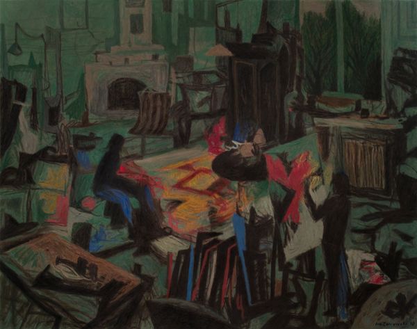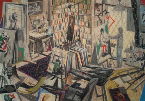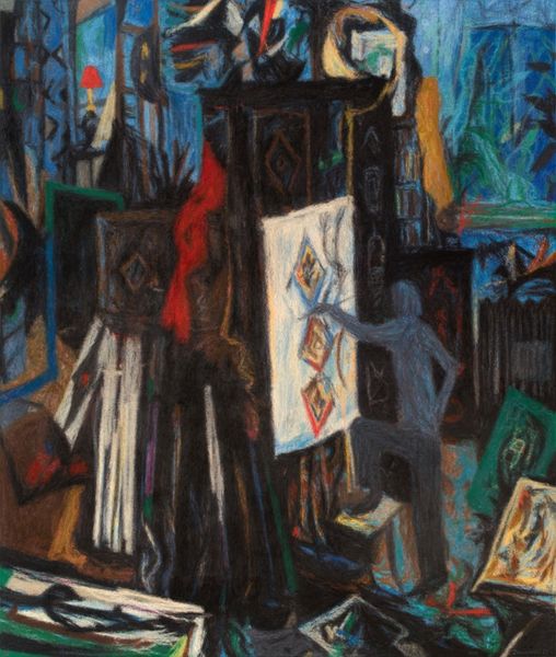 Iwo Zaniewski's 'Portrait of the Artist' presents a dense, textural image of an artist in their studio. A pervasive network of strokes overlays the entire surface, creating a palpable sense of depth. The colour palette is muted, punctuated by vibrant reds, yellows, and greens, evoking a dream-like interior space. The artist's formal approach yields rich, semiotic readings. The image of the artist, hunched before a canvas, is juxtaposed with a portrait on an adjacent easel. The semiotic interplay between the artist and their subject explores themes of self-representation and identity. The window frames a dark, external world, contrasting with the cluttered, interior world of the studio. The painting is less a depiction of a physical space than a construction of a psychological state. It suggests that the act of painting is not simply a technical exercise, but a philosophical exploration of the self. Zaniewski invites us to contemplate the relationship between the artist, their work, and the world around them.