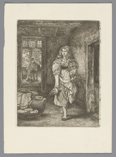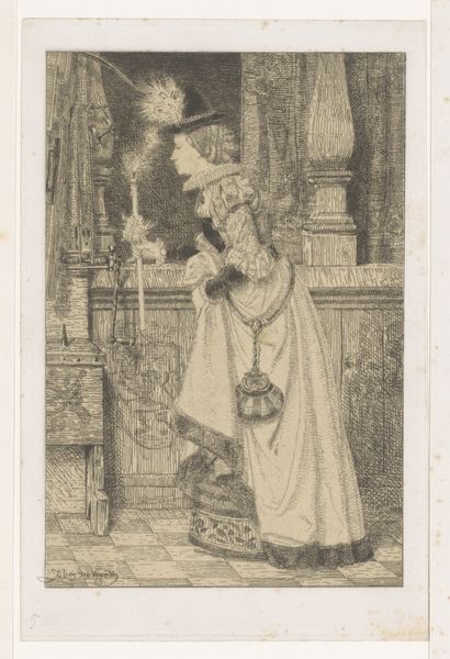 Willem Linnig's etching presents a young man indoors, adjusting his necktie. Consider the etching technique itself. It is an indirect method, requiring the artist to prepare a metal plate, cover it with a waxy, acid-resistant ground, then draw through the ground with a sharp needle, exposing the metal. The plate is then immersed in acid, which bites into the exposed lines. This process demands precision and control, and the resulting image has a distinctive graphic quality. Note how Linnig uses this to full advantage. The density and direction of the etched lines create tone and texture, defining the forms of the figure, the drapery, and the ornate interior. Look closely, and you'll see how the hatching varies to suggest light and shadow, giving depth to the scene. The etching medium lends itself particularly well to capturing intricate details, like the patterns on the wallpaper, underscoring the artistry involved in producing a seemingly simple image of everyday life. Paying attention to the making of the print enhances our appreciation, reminding us of the skills and labor involved in bringing art into the world.