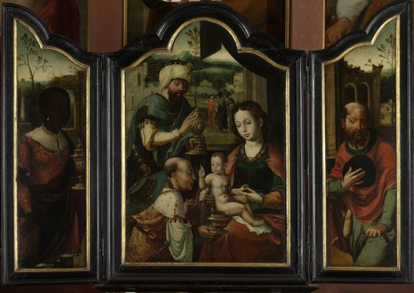 Curator: The piece before us, hanging here at the SMK, is "The Parable of the Wise and Foolish Virgins," an oil on wood created between 1593 and 1623, attributed to Hieronymus Francken II. What strikes you initially about this densely populated interior? Editor: An immediate impression: theatrical. The stage is crowded, and the palette, dominated by deep reds and blues, gives a certain heavy density to the composition. Curator: That's a keen observation. Think about this parable in its time: these are wealthy women, the privileged class. Francken is, in a way, holding a mirror up to their status, critiquing their pursuits and societal roles. The "foolish virgins" would represent the vice of the wealthy, of course. It brings into sharp focus themes of female virtue and class critique that reverberated in a very religiously dominated Europe at the time. Editor: Right, there is a marked contrast created between that group on the left engaged in religious acts with a group seemingly concerned with worldly pleasures. This opposition of course also occurs in paintings on the walls, particularly the explicit love scene with a male nude on the upper right. Semiotically, it sets up a stark binary. The composition's complexity—all those overlapping forms—speaks volumes about visual tension. Curator: Precisely, those painted works reinforce Francken's thematic purpose in depicting those binaries, and, indeed, they heighten the understanding of how elite society may consume art in and of itself. It seems they preferred to hang up salacious nudes, more often than pious scenes. So is Francken indicting these women and men for engaging in that vice as part of the world in which they occupy? How are gender, wealth, and piety all intersecting in this narrative? Editor: Intriguing to contemplate, even the textural variations add another layer, from the reflective sheen on the ewers to the deep opacity of the draperies, adding to the painting’s sophisticated and multifaceted dialogue of virtue, vice, and worldliness. Curator: So, as we reflect on Hieronymus Francken II’s parable, it prompts us to ask: how do the choices of a society reflect its values? How can artistic style reflect society's flaws? Editor: Indeed. "The Parable of the Wise and Foolish Virgins" not only visually captivates, but stimulates the ongoing, ever-relevant inquiry into art, morality, and the mirrors societies hold up to themselves.