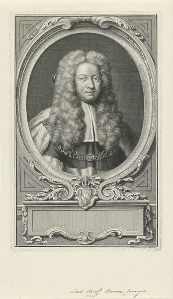 Editor: This is Jacob Houbraken's "Portret van Hieronymus van Beverningk," an engraving from the mid-18th century, currently held at the Rijksmuseum. It's so meticulously detailed! The oval frame and architectural base give it a formal feel. What strikes you about this portrait? Curator: Formally, I observe a dedication to line and form, a hallmark of engraving. Note how the artist meticulously uses hatching and cross-hatching to create tonal variations, skillfully simulating the textures of Beverningk’s garments and hair. Does the visual vocabulary employed suggest any contemporary trends in aesthetics? Editor: It reminds me of Baroque portraits but without the same grandeur. It is detailed, yet somehow constrained? Curator: Precisely! The oval frame constricts the subject, focusing attention on the face. Furthermore, consider the architectural elements. Do they simply act as a pedestal for the portrait, or might they suggest something about Beverningk’s standing? Editor: I guess it elevates his status in a structured, formal way, rather than relying on overt displays of wealth or power? Curator: Indeed. The artist presents Beverningk as a figure defined by intellect and order, reflected in the rigorous composition of the piece. It’s not just a likeness but a carefully constructed visual argument about the subject. What do you make of the empty space below the oval frame? Editor: It seems unfinished. Or is it meant for text, some sort of caption or dedication perhaps? Curator: I suggest it’s a liminal space that frames the portrait while drawing your attention to the overall composition and structure. It invites speculation. Formally, the geometric pattern balances and anchors the oval shape containing Beverningk's likeness. What's your conclusion regarding the artist's choices? Editor: I see now how every aspect, from the lines to the framing, contributes to a very deliberate presentation of the subject's character. Thanks! Curator: Likewise, contemplating the relationship between line and form is key to grasping its lasting appeal.