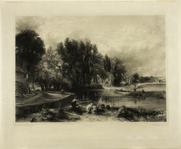 Curator: Immediately striking, isn't it? The density of the etching gives the whole scene a weighty, almost somber feel. Editor: Indeed. We’re looking at David Lucas's "River Stour," made around 1830. It’s a print, combining etching techniques with drawing, currently residing at The Met. It shows a tranquil waterscape, figures in boats, a bridge… A quintessentially Romantic scene. But I'm curious about the paper choice here. How does its texture affect our perception of the image? Curator: Absolutely. The layering of etching suggests significant hand-labor, requiring highly specialized knowledge for each impression. Look closely, and you notice that this is no mass-produced illustration, but a result of individual craftmanship and the quality of materials chosen: both ink and paper were vital. Moreover, think of how prints facilitated wider access to art and knowledge within the evolving structures of the art market. Editor: Good point. Prints like this played a key role in disseminating imagery. And this subject—rural England—spoke directly to the cultural anxieties of the Industrial Revolution. Lucas and artists like him reinforced a longing for an idealized, pre-industrial past, impacting ideas about national identity. This resonates with current debates about the role of visual imagery and collective memory. How do scenes like these contribute to constructing ideas of ‘Englishness’ and whose story does this art reflect? Curator: Precisely! Examining these themes involves delving into class structures as reflected in artwork production. The labor invested wasn’t just that of the artist or etcher; networks of laborers made production and distribution of prints possible. Each one a commodity and testament to a socioeconomic context— and consumption of them reinforced particular social roles. This particular print showcases a distinct interaction with social constructs, providing fascinating ways of interpreting this visual imagery. Editor: It is thought provoking. I walk away wondering how Romantic-era scenes served ideological roles, both reflecting and shaping perspectives. Curator: Me too! Thinking about the materials involved reminds us to ask critical questions regarding the networks of labor behind art history—networks sometimes deliberately obscured within notions of solitary genius.