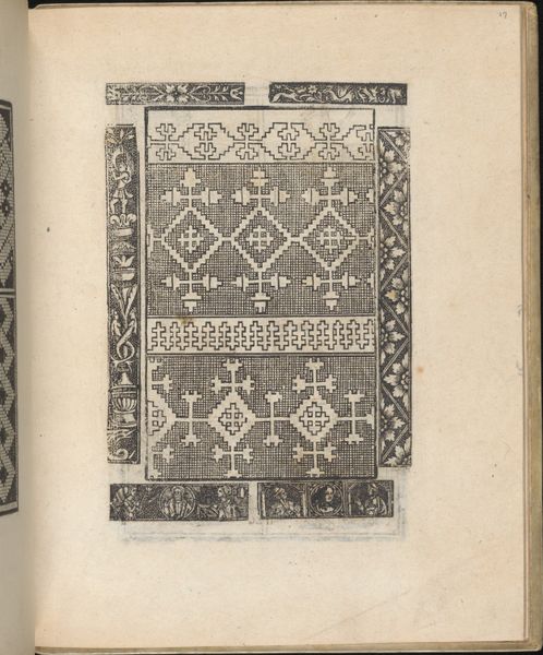Editor: This is "Esemplario di lavori, page 11 (verso)," a woodcut print made in 1529 by Nicolò Zoppino. It’s like a sampler of patterns, all in tight black and white. I find the rigid geometry quite calming; what do you see in it? Curator: Ah, calming, you say? I find it a bit of a fever dream, actually! All those tiny squares…but, yes, the overall effect is surprisingly ordered. It's Italian Renaissance, intended as a source book for lacemakers and embroiderers. Imagine someone painstakingly copying these patterns! The geometric precision contrasts beautifully with the little birds and stylized flowers, don't you think? Editor: It’s interesting how the birds and flowers are just as geometric as the other shapes. Were patterns like this popular back then? Curator: Hugely popular! Pattern books democratized design. Suddenly, you didn’t have to be a court artist to create something beautiful. You could pick up a woodcut like this, and boom – instant ornamentation. It's fascinating how art and craft intertwine. Makes you wonder about our obsession with "originality" today, doesn't it? Editor: So, it’s a practical tool that is also, in its own way, a work of art. I never thought of pattern books that way before! Thanks! Curator: Exactly! It makes you rethink how creativity can show up in unexpected forms and everyday items, wouldn't you agree?