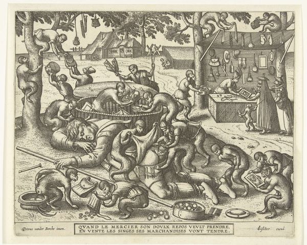 This etching, "De Rogstekers van Weert," was made around 1650 by an anonymous artist. Its lines are brought to life through the intricate process of etching, which likely involved coating a metal plate with wax, drawing a design, and then biting the plate with acid. The material itself, metal, is key to understanding this artwork. Metal resists, it’s difficult to work with, and yet the etcher was able to create an impressive amount of detail and visual information. Consider how this etching, a relatively accessible medium, democratized visual storytelling. While painting remained the realm of the wealthy, etchings allowed for the mass production and distribution of images. It offers a glimpse into a pivotal moment when art began to circulate more widely, influencing public opinion and cultural values. The meticulous work required to produce such a detailed image speaks volumes about the artist's dedication. The act of etching becomes a physical manifestation of social and political commentary, demonstrating the power of craft in shaping cultural narratives.