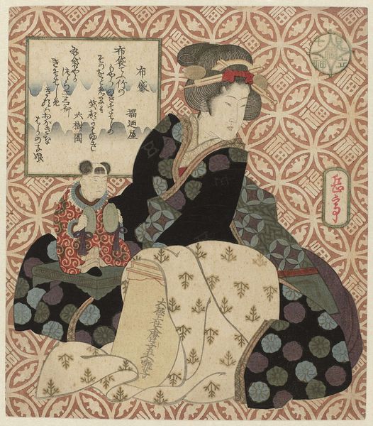 Utagawa Sadakage created this woodblock print, "Bal," around the mid-19th century. It features a figure framed by a gourd-shaped border against a cool, patterned blue backdrop. The lines are delicate, defining forms with soft precision. The composition's structure is intriguing; the central figure interacts with a cat, drawing the eye through a series of interconnected shapes. Observe how the floral patterns on the woman's robe contrast with the geometric regularity of the window behind her. Sadakage employs a semiotic language through these details, hinting at the themes of domesticity and beauty. Consider how the print destabilizes traditional representations by playing with space and perspective, and by employing culturally coded images. The gourd shape, the cat, and the kimono patterns are not merely decorative; they are integral to the artwork's complex visual and cultural narrative, and it is within their interpretation that the ever-shifting meaning of the artwork resides.