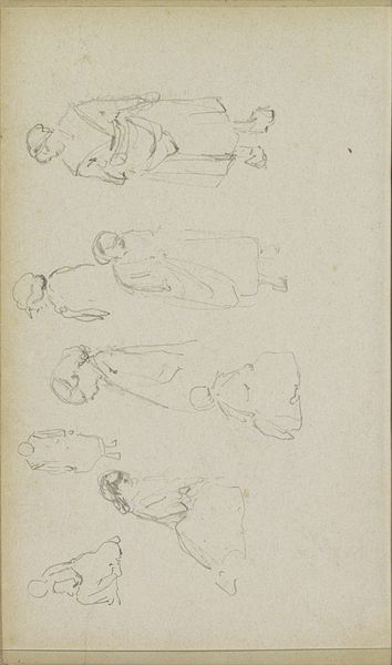 This is a page of studies in graphite, titled "Paard en figuurstudies", by Johannes Tavenraat. The composition reveals a seemingly random assortment of figures and a horse, each rendered with a swift, economic line. Tavenraat's approach emphasizes movement and form, capturing the fleeting essence of his subjects. The figures are rendered in various poses, some reclining, others standing, creating a dynamic interplay of spatial relationships. Tavenraat’s sketches invite a semiotic reading. Each figure, though quickly drawn, carries the cultural codes of its time. The hats, the dresses, the very postures of the figures speak to the social structures and norms of the 19th century. The horse, a recurring motif in art history, may symbolize energy, freedom, or even the artist's own creative drive. The artist doesn't fix meaning but rather opens up a space for interpretation. The unfinished quality of the sketches draws attention to the process of art-making itself. It’s in this openness, this lack of resolution, that the drawing finds its enduring appeal.
