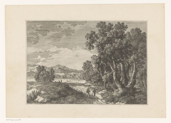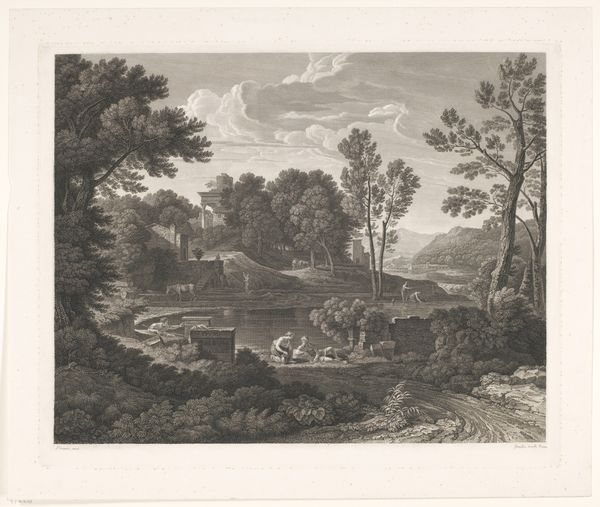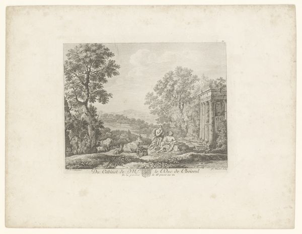 Curator: Oh, this engraving just breathes serenity. The softness! Editor: We're looking at Jean Jacques de Boissieu's "Resting Shepherd with a Herd of Goats in a Landscape" from 1804. It’s an engraving on paper, placing us squarely in the Romantic era. I can feel a strong undercurrent that highlights the impact of agricultural labor on people's access to land. Curator: Precisely! See how the single, leaning tree in the foreground kind of anchors the whole composition? There’s a solitude there, but also a sense of belonging. Editor: It's pastoral, certainly. The landscape is dotted with architectural ruins, signifiers of empires gone by, and juxtaposed to a working-class contemporary rural setting, so we must remember how notions of idyllic rural life often romanticized—or actively concealed—the realities of rural poverty. Curator: I see it as this harmonious balance though. A blending of human life within the landscape—unpretentious. Almost like finding peace with the passing of time. Editor: The architectural ruins absolutely speaks of time's passage. There is, however, also the issue of artistic license. De Boissieu may well have selected which parts of the scenery he would amplify or omit. The politics of landscape art are quite tricky to dismiss. It invites a needed examination of power structures and their impact on representations of land and labor. Curator: Even still, aren’t the light and shadows dreamy? And that shepherd—doesn’t he seem content in his smallness, within all that expanse? The tiny flock against a big vista somehow comforts me. Editor: Yes, de Boissieu's attention to light is very delicate. This type of visual harmony also acts as propaganda. I always urge viewers to question whose interests the artwork actually represents. Curator: Alright, that's certainly something to think about while contemplating this scene. It certainly has given me pause. Editor: Exactly. By connecting its historical setting with modern, intersectional critiques, one discovers a more profound understanding of what Romanticism conceals and what is so moving about this style.