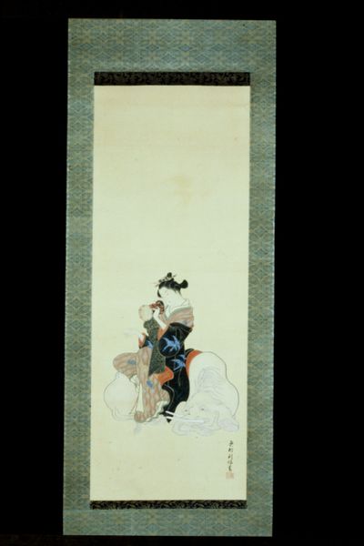 Editor: This scroll painting, "Courtesan Reading a Letter" by Ishikawa Toyonobu, created sometime between 1734 and 1766, captures such a quiet, intimate moment. She seems so engrossed in the letter. How do you interpret this work in the context of its time? Curator: That's a great observation! I see this as an important genre painting reflective of the ukiyo-e tradition. Its focus on the floating world, the transient pleasures available particularly in urban centers. Think about how this image circulated: as a print. This speaks volumes about its purpose and its audience, broadening the world through accessible artwork. What is suggested about societal expectations, considering the role of courtesans within Edo-period Japan? Editor: I see what you mean. It wasn't necessarily about capturing reality, but portraying a version of reality. The courtesan is depicted in this peaceful domestic scene. Curator: Exactly. It idealizes that aspect, carefully managing perceptions of the Yoshiwara district where these women lived. Her kimono, the perfect stillness – this controls a very specific, marketable persona. Consider who would purchase this print, and why. What does that tell us about class, desire, and the power of representation? Editor: So, it's less a direct record of daily life and more about carefully curated imagery within the existing cultural power dynamics? Curator: Precisely. Think about the artist's role, too. They weren't passive observers. Toyonobu actively shaped perceptions, negotiating complex social realities through imagery intended for consumption. It is a business. These prints contribute to and influence ideas of beauty, leisure, and femininity. Editor: That's fascinating. It really highlights how art can be both a product of and a shaper of cultural values. Curator: Agreed. It shows how art participates in a dialogue that both creates and responds to an audience. The piece invites us to engage in questioning representation in society.