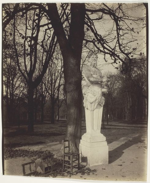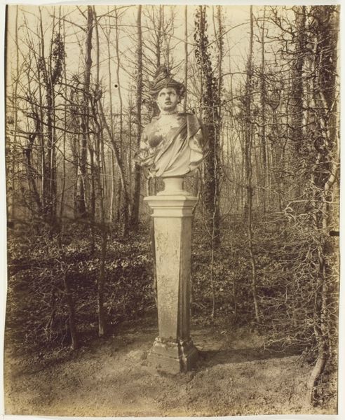 Curator: What a captivating scene. Eugène Atget captured this view of "Versailles, Bosquet de l'Arc de Triomphe" in 1903. Editor: My initial impression is of a quiet melancholy. The light is muted, almost sepulchral, and the leafless trees add to the sense of dormancy. Is this a photographic print? Curator: Yes, a gelatin silver print. Note the strategic placement of the bust—perhaps Minerva, the goddess of wisdom and strategic warfare? Its stoic expression is certainly arresting. Classical symbols placed purposefully in what was meant as royal relaxation space. Editor: The material reality of Versailles is always fascinating. While the sculpture might embody ideals of power and classicism, it’s made of earthly marble, extracted and shaped by labor. These grand gardens were meant for royal leisure but relied on an army of workers. Curator: Precisely! And the gardens themselves, redesigned throughout the 17th and 18th centuries, reflect shifting aesthetic ideals, echoing classical forms while showcasing royal dominance over nature. Do you think Atget's work holds up today as art? Editor: Atget saw himself primarily as a documentarian, yet this print hints at larger socioeconomic arrangements between people and environment. But the physical print—the paper, the gelatin, the silver—becomes art when viewed and analyzed in different cultural circumstances. I like how he reminds us that idealized symbols stand on something concrete and touchable. Curator: It’s as if he’s deliberately capturing the remnants of grandeur fading into time, or perhaps highlighting their ever-present significance despite it all. A statement in how cultures keep alive values by recontextualizing them. Editor: Ultimately, Atget shows how these garden monuments operate as social artifacts, quietly recording layers of work, consumption, and material transformation. It invites us to explore where beauty truly resides – in grand statements, or in modest components.