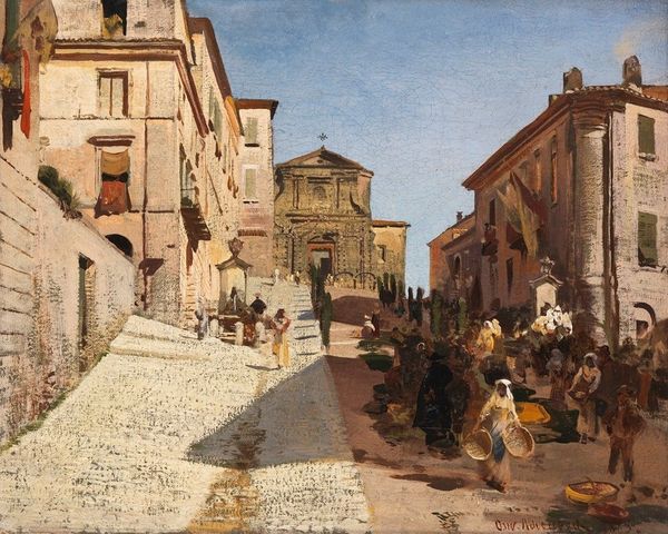 Editor: Here we have Richard Parkes Bonington's "Corso Sant'Anastasia, Verona, with the Palace of Prince Maffei," painted in 1826. It looks like oil paint and watercolor on paper. The street scene is beautifully rendered, and there's a real sense of movement with the procession. What do you see in this piece? Curator: This artwork offers a glimpse into the intricate dance between power, religion, and social life in 19th-century Verona. Consider the street itself: architecture acting as a stage for religious expression. Who has access to those balconies, draped with banners? What does it mean for them to observe rather than participate? It reflects existing socio-economic stratifications. Bonington's decision to highlight that contrast becomes crucial. What commentary do you think he’s making? Editor: That's a fascinating way to look at it. I hadn't considered the balconies as symbols of power. Do you think his own background influenced that perspective? Curator: Absolutely. As an English artist depicting Italian society, his gaze is inherently that of an outsider. Was he romanticizing the scene, or subtly critiquing the social hierarchy? It's about the tensions within the artwork, how he chooses to represent it. Does the work celebrate the ritual or question the exclusive access to spectacle? Editor: So, looking beyond the pretty picture to understand the artist’s own social position and potential biases. Curator: Precisely. And how that position informs the choices he makes in representing power dynamics. That’s where the true richness of art history lies, wouldn’t you agree? Editor: Definitely! I'll never look at a cityscape the same way again. Thanks for illuminating all the details behind Bonington’s work.