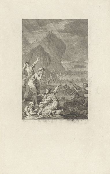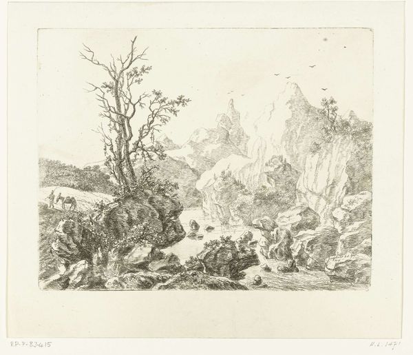 Editor: So this etching is called "Le Gué," or "The Ford," made by Odilon Redon in 1865. There's this stark, almost theatrical landscape, and then these tiny figures crossing the water. It feels like some grand myth is being enacted, but I can't quite put my finger on it. What do you make of it? Curator: "The Ford" indeed. Consider, the ford as a place of transition, a liminal space between here and there. Water, often a symbol of the unconscious, requiring a journey through. Notice how the figures are small in relation to the imposing landscape. Doesn't it suggest humankind's often precarious position within a larger, perhaps indifferent, world? Editor: That scale is striking, yes. They seem insignificant against those towering rocks. But what about the act of crossing itself? What symbolic weight does that carry, beyond the literal? Curator: Think of the historical context. The mid-19th century was a time of great social and scientific change. The journey could represent the crossing from the old to the new. Etching as a medium allowed for fine lines and shadows, but consider that those blacks could mean mystery and the unknown in what this 'new' is supposed to offer. This group journeys forward, towards us. Are they triumphant? Are they searching? Or are they lost? Editor: I hadn’t considered the 'Romanticism' aspect to this piece, but now that you mention the scale and symbolism, that unknown 'new' world appears even more ambiguous. It is so fascinating to think of it representing such historical transition through that kind of visual language. Curator: Indeed. The image seems simple, but carries a range of powerful cultural memories and ongoing relevance, especially as transitions continue to shape us all. Editor: It is certainly making me rethink what I originally assumed! Thanks for broadening my perspective.