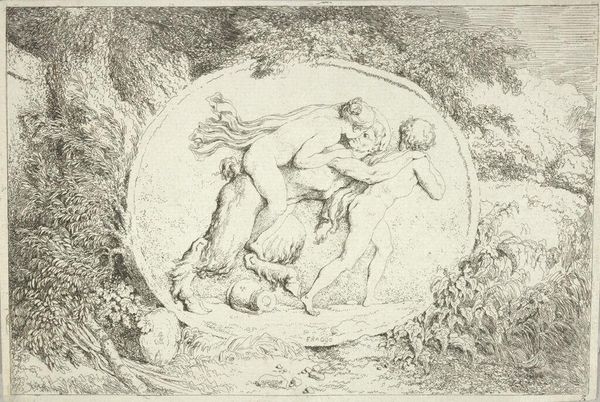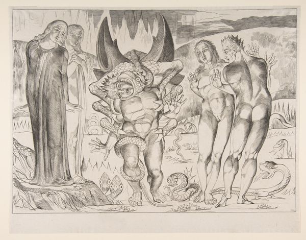 Curator: This is William Blake's vision of the Eighth Circle of Hell, "The Circle of the Corrupt Officials: The Devils Tormenting Ciampolo." Editor: What strikes me is the raw vulnerability. Ciampolo's figure is so exposed, so fragile, against the imposing devils. Curator: Blake's stark lines and shading create a brutal scene, a sharp critique of corruption. He really highlights the power imbalance. Editor: It's visceral, isn't it? You feel the sting of the devils' torments. Almost like Blake's translating the abstract idea of hell into a physical experience. Curator: Absolutely. His focus was to expose the hellish reality of earthly corruption, not just illustrating Dante, but igniting a fire in his audience. Editor: A timeless commentary, really. It reminds us that the consequences of corruption—the sting of injustice—transcend any particular time. Curator: It certainly does. This piece really sticks with you, a reminder that the devils are always present, in one form or another. Editor: Indeed. It makes you question what hell really is, doesn't it? Perhaps it's not a place but a state of being.
