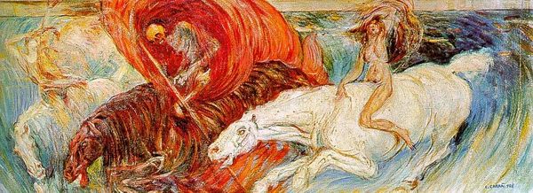 Frantisek Kupka painted Ballad of Epona in an unknown year, and it presents us with a scene of two nude women riding horses along a shoreline. This image from Kupka, a Czech artist working in France, draws on ancient Celtic mythology, specifically Epona, the goddess of horses. But it reinterprets this myth through a decidedly modern lens, influenced by the burgeoning Symbolist movement of the late 19th century, which sought to represent absolute truths through evocative images. Kupka made this image during a period when the nude body and classical themes were being re-evaluated in art schools and institutions. The image might therefore be seen as a progressive commentary on the traditional artistic canon. To fully grasp its complexities, we need to delve into the cultural and institutional context of the early 20th century. Research into the artistic and social climate of the time, including period writings and art criticism, can help us understand how Kupka's work both reflected and challenged the norms of his era. Art is not made in a vacuum, and its meaning is always contingent on the social and institutional contexts in which it is created and received.