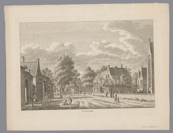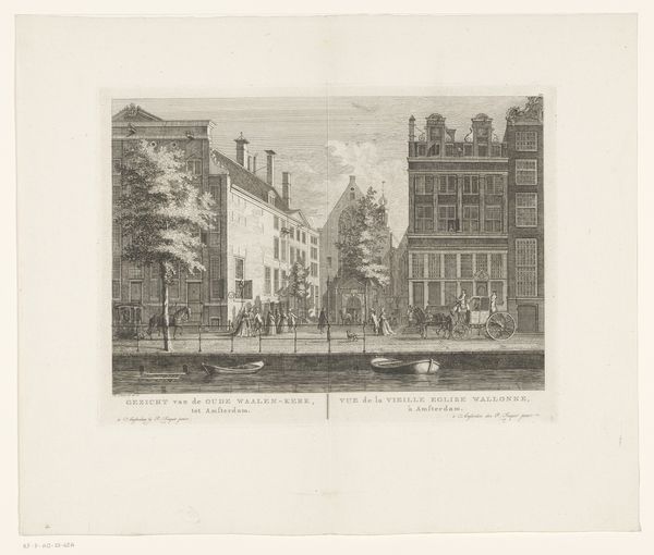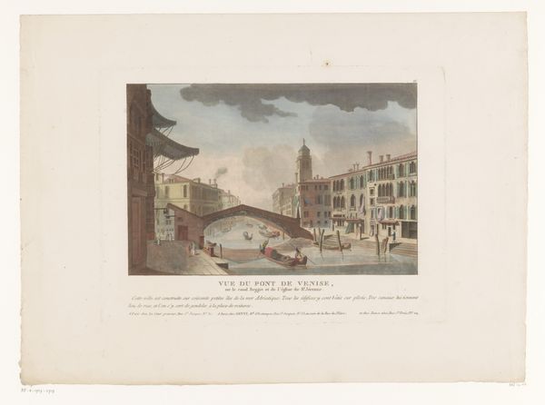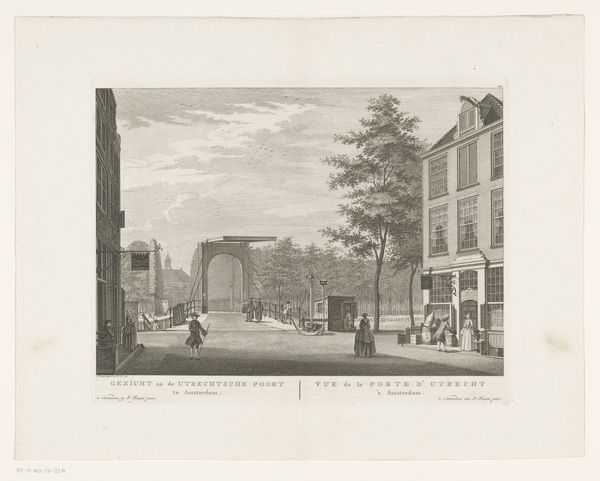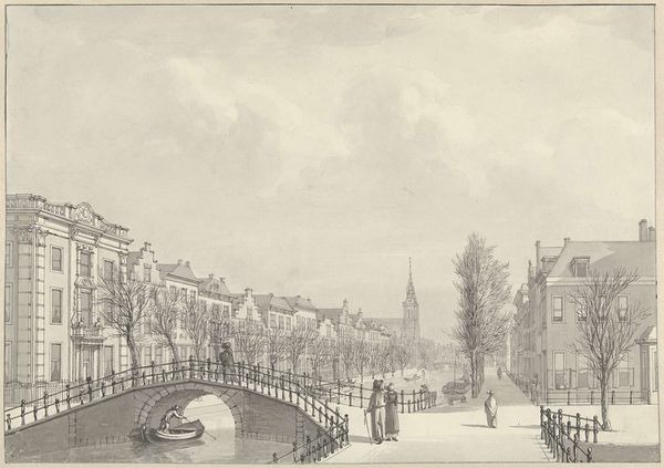 Curator: This delicate engraving presents a tranquil cityscape titled "Gezicht op het Rapenburg te Leiden van de Nieuwsteegbrug," created in 1807 by Reinier Vinkeles. It resides here at the Rijksmuseum. Editor: It strikes me as almost melancholic. The light is subtle, the palette nearly monochromatic, save for the warm tint of aged paper. Everything feels quite still. Curator: The formal arrangement emphasizes horizontality, doesn’t it? The composition relies on the repetition of rectangular forms, buildings reflected in the canal, balanced by the curvilinear bridge. Notice how the lines become sparser toward the sky, giving a sense of airy openness. Editor: Yes, that strong horizontality lends it a certain gravity. The waterway and the bridge over it immediately signal passage, transition. Water often represents the subconscious; it makes me think of collective memory in Leiden. And the bridge serves as a powerful, classic symbol, no? A link between two worlds. Curator: Absolutely. Vinkeles utilizes a sophisticated play of light and shadow, creating depth through precise linework. It demonstrates the Neoclassical precision valued at the time. Look how clearly defined each architectural element is, down to the window panes. Editor: And how the architectural features along the canal each vary slightly in ornamentation... but they're very proper! They’re all upright, respectable houses. The symbolism is rather bourgeois, isn't it? This is an ode to societal order, perhaps. A subtle visual justification of that societal structure. Curator: An interesting reading! What strikes me most is how Vinkeles achieves a sense of balance between rigorous observation and artistic interpretation. This interplay enhances the drawing's complexity, making it more than a simple reproduction of a scene. Editor: Ultimately, its evocative power rests in its understated elegance. There’s an atmosphere of bygone days captured within. I can’t help but contemplate all the unseen histories within these solid forms. Curator: Yes, I find that the more one looks, the more nuanced it becomes. Thank you for sharing your perspectives.